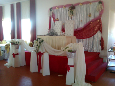 Dazu haben wir ein grosses Repertoire an Dekorationsmöglichkeiten die für eine romantisches Ambiente sorgen. Neben Lichterketten haben wir auch zahlreiche Tücher und Gegenstände wie zb.: 2 Goldene Herzen oder das Schwert das übergeben wird. Auf dem Bild sehen Sie eine Variation wie der Platz des Hochzeitspaares gestaltet werden kann.
